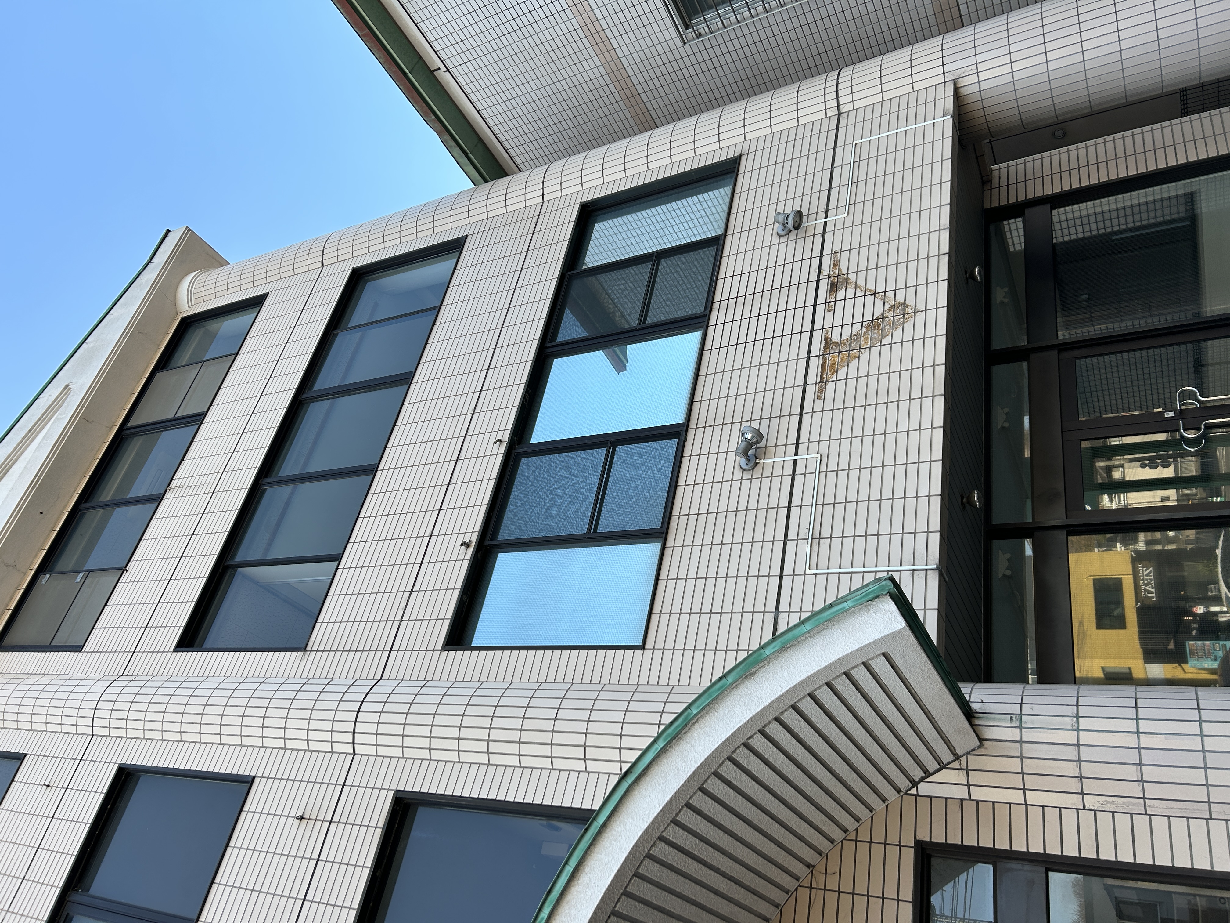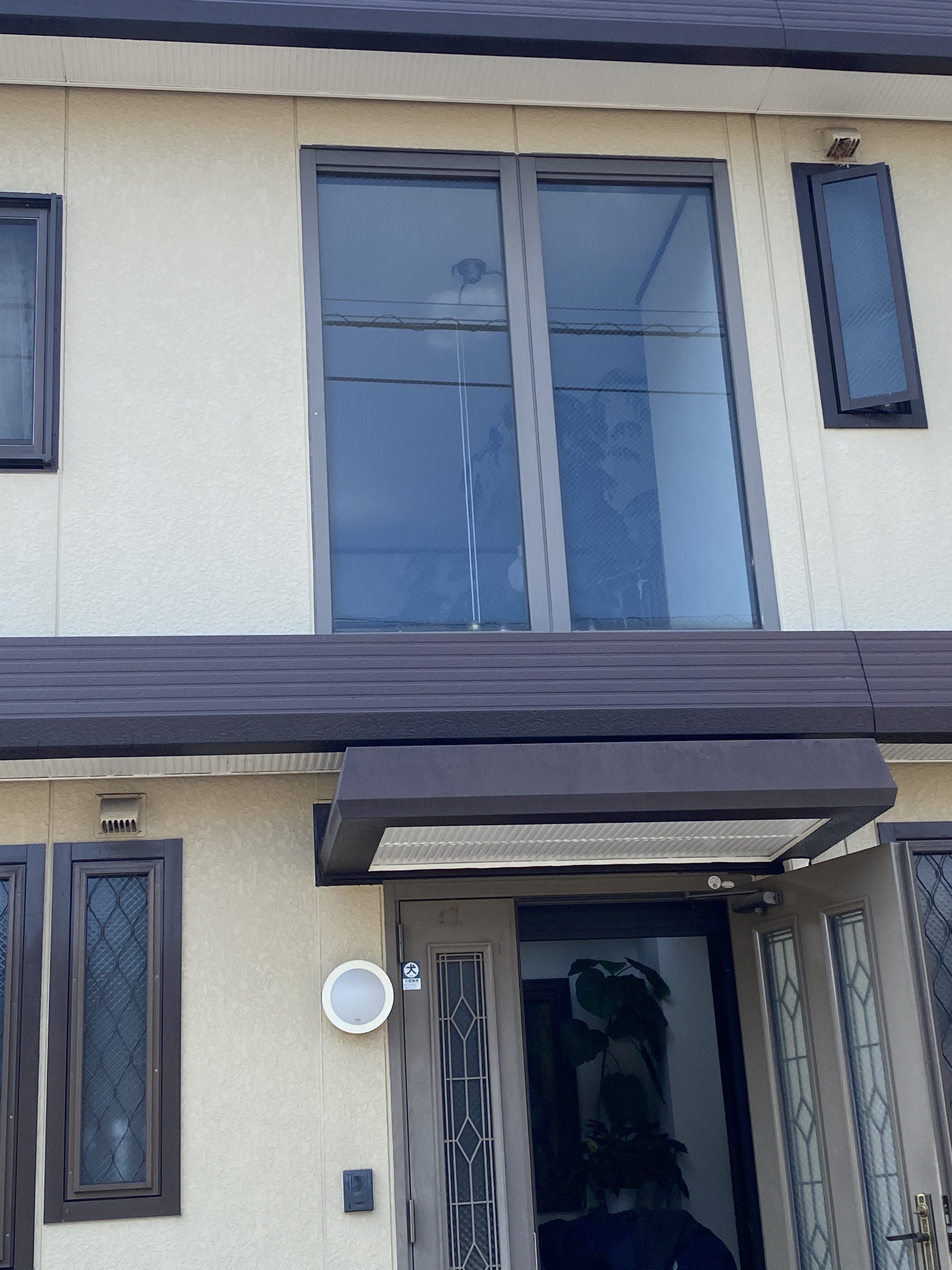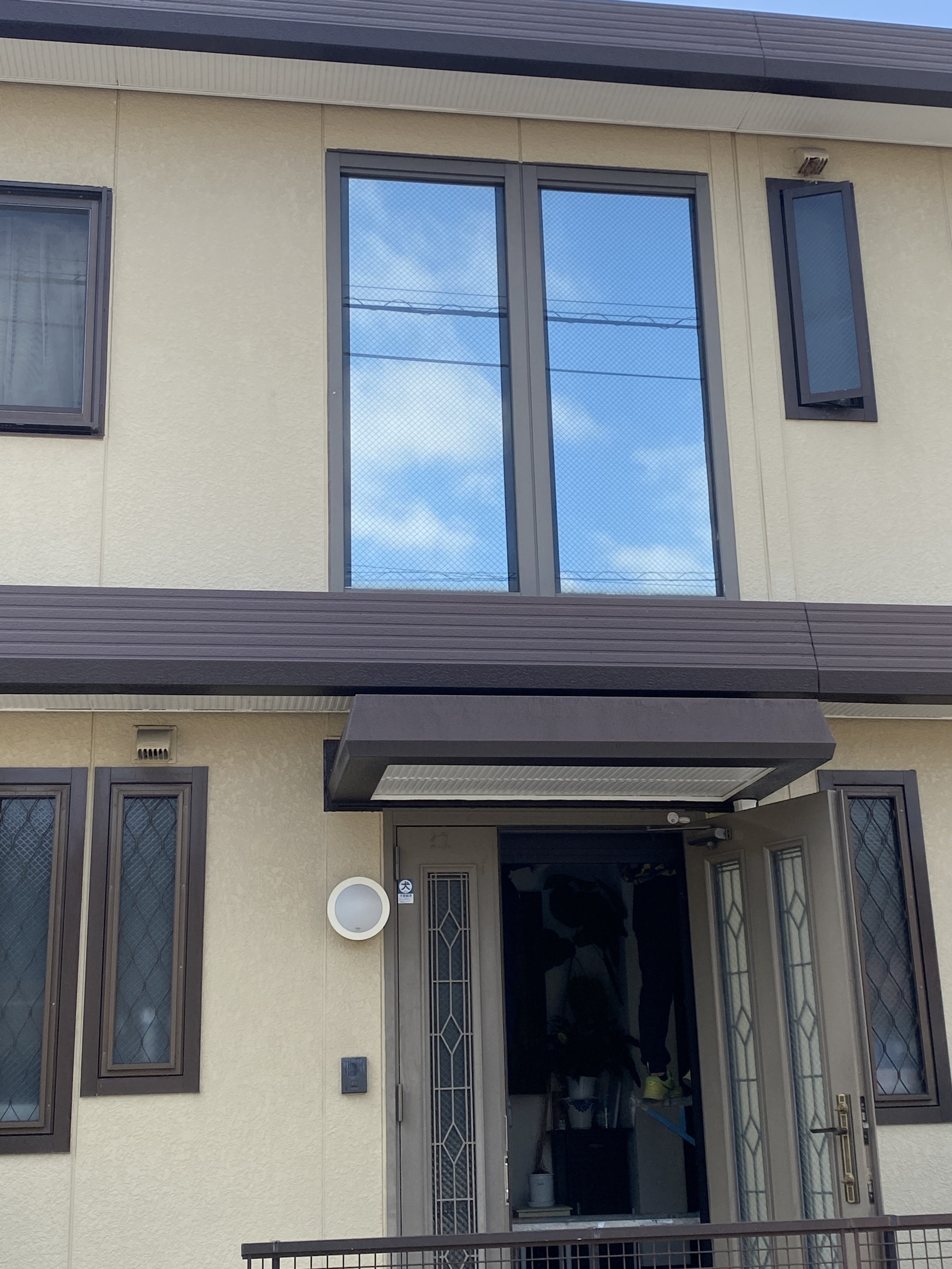 施工後の外観です。ミラー効果で外からの視線を遮断し、飛散防止・UVカット機能も備わりました。